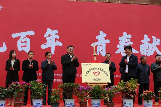 江西省血液中心向我校和江西软件职业技术大学颁发大学生无偿献血爱心教育基地铜牌,同时宣布2021年无偿献血联盟活动启动,并为无偿献血联盟活动签名。