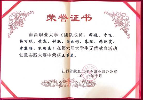2021年11月13日下午,第六届大学生无偿献血活动创意实践大赛暨第五届“热血英雄传递洪城之爱”大型公益活动颁奖仪式在南昌日报社举行。仪式总结了大赛活动成果,表彰了先进院校,部署了相关工作。