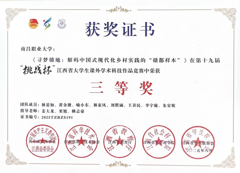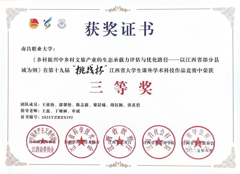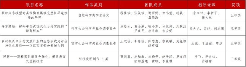近日,共青团江西省委、江西省教育厅、江西省科学技术协会、江西省社会科学院、江西省学生联合会联合发布《第十九届“挑战杯”江西省大学生课外学术科技作品竞赛获奖结果通报》。我校参赛团队凭借出色的表现在赛事中脱颖而出,荣获省级三等奖4项。